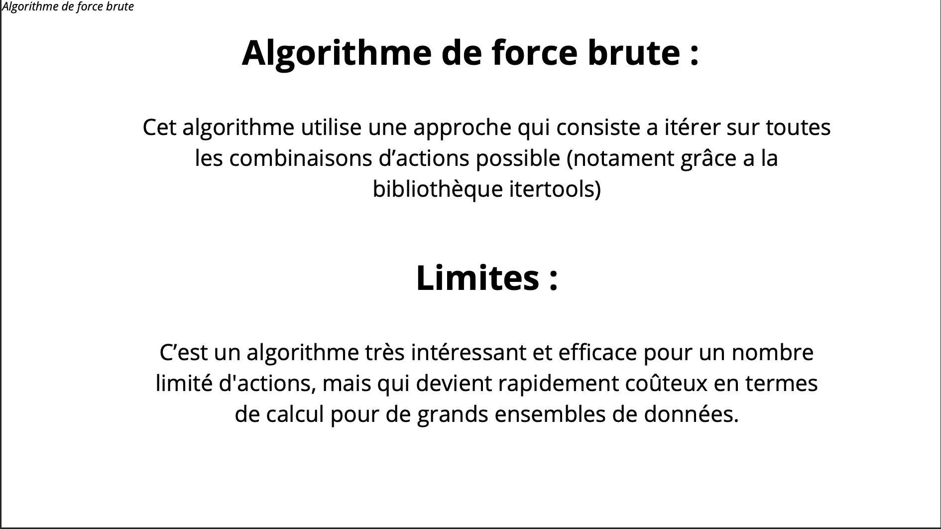 Conception et optimisation d’algorithmes d’investissement en Python (brute-force / optimisé).