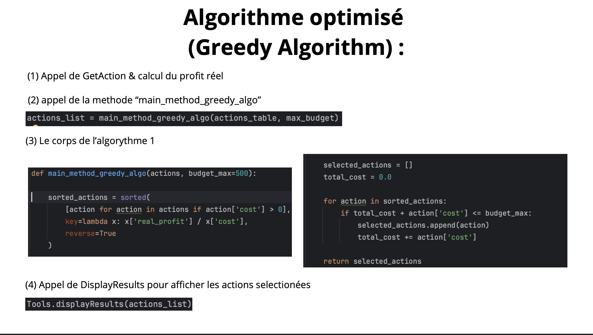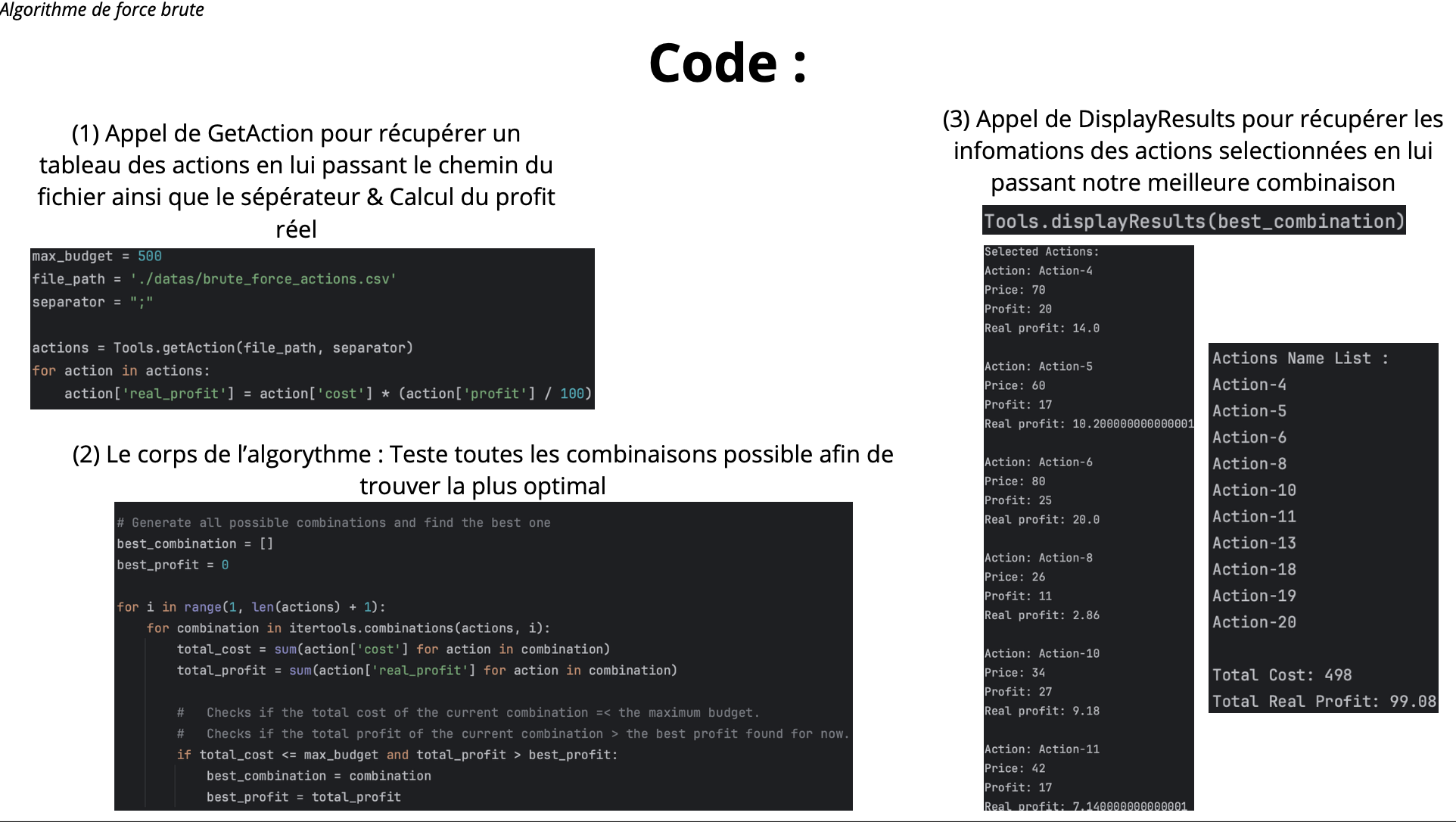 - Mise en place d’un programme lisant un fichier de données (nom de l’action, coût, bénéfice) et proposant la meilleure combinaison d’investissement.