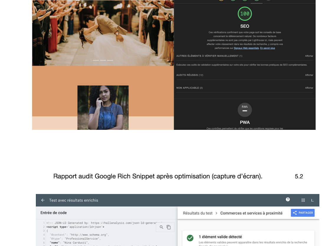 - Mise en place du référencement local (Schema.org) et des métadonnées sociales (Open Graph, Twitter Cards).